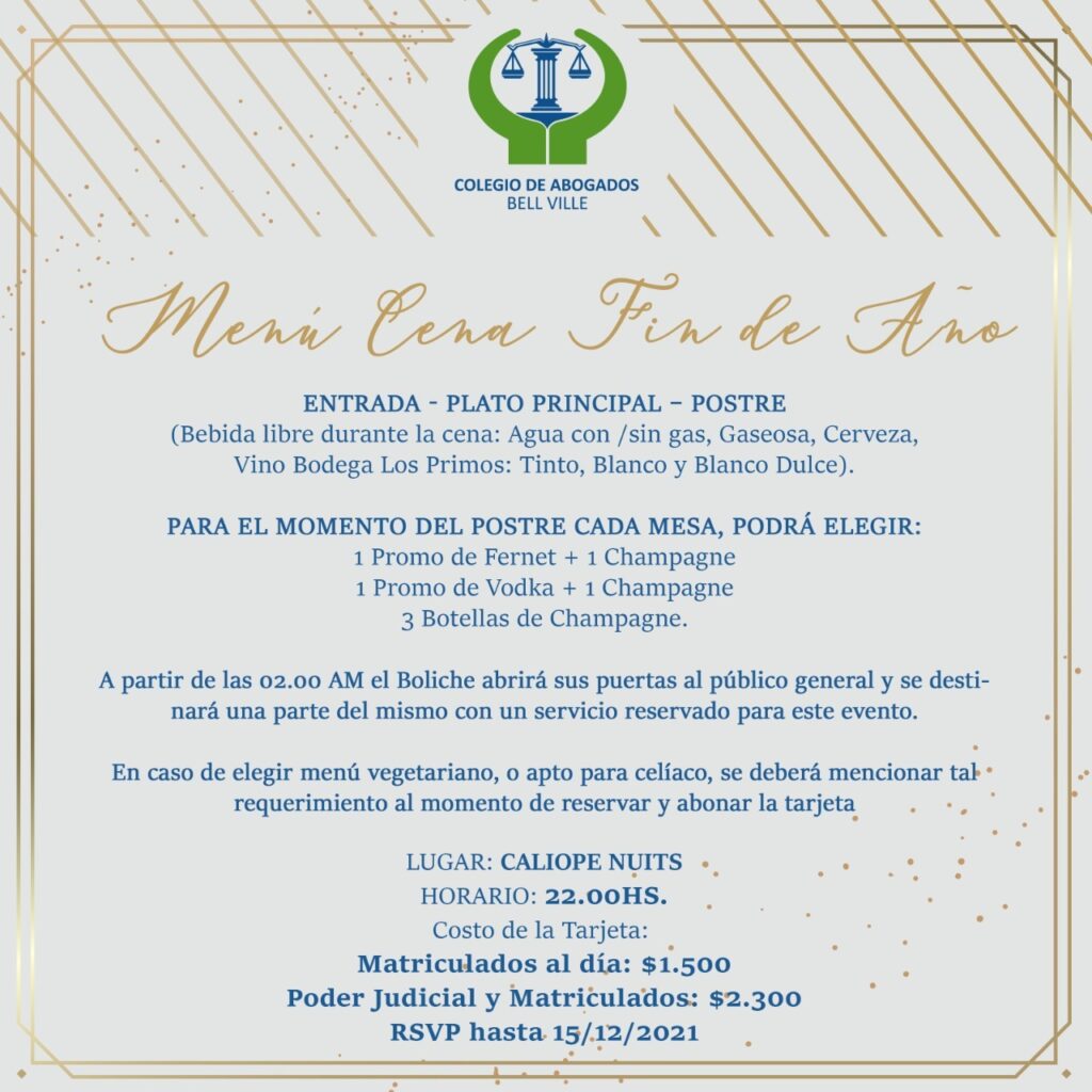 Bell Ville Golf Club, con un costo general de $ 38.000, para colegiados sin deuda de aportes complementarios $ 33.000 y para jóvenes abogados con aportes regularizados hasta el año 2023, el valor es de $ 28.000. Se ruega efectuar las reservas con antelación, en la sede del Colegio de Abogados, hasta el día martes 27 de agosto.